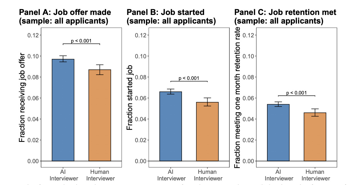 Note: The figure displays the recruiting outcomes of applicants. Each panel displays the fraction of applicants who realize the specific outcome. Fractions are displayed separately for the Human Interviewer condition, in which applicants are interviewed by a human, and for the AI Interviewer condition, in which applicants are interviewed by an AI voice agent. Bars indicate 95% confidence intervals; p-values calculated from a two-sample proportion test.