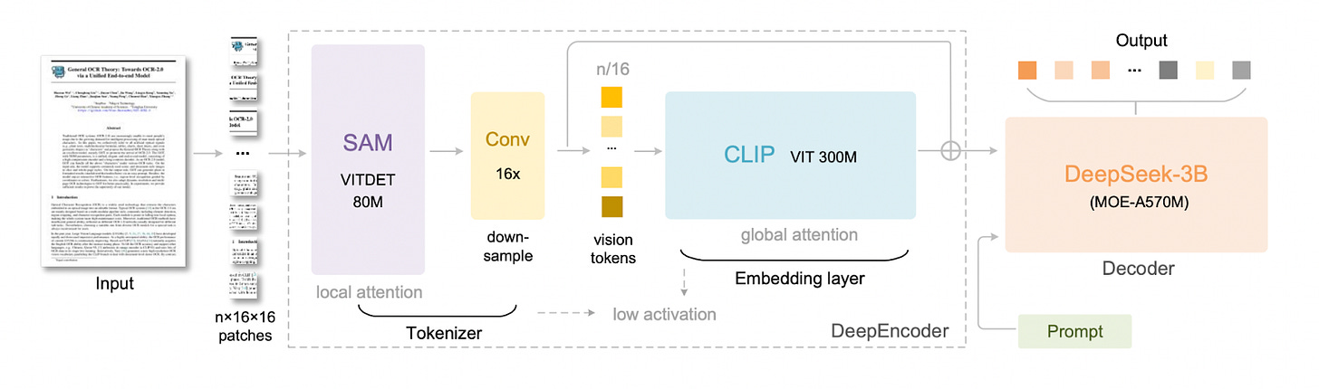 This is all accomplished with a custom DeepEncoder and a 3B Mixture-of-Experts decoder. DeepEncoder is the core of DeepSeek-OCR, comprising three components: a SAM for perception, dominated by window attention; a CLIP for knowledge, with dense global attention; and a 16× token compressor that bridges between them. Its optical compression technique is the standout innovation: it maps text into a 2D visual format, exploiting redundancies within image patches (e.g., similar fonts or layouts) to achieve higher semantic density per token than linear text sequences.
