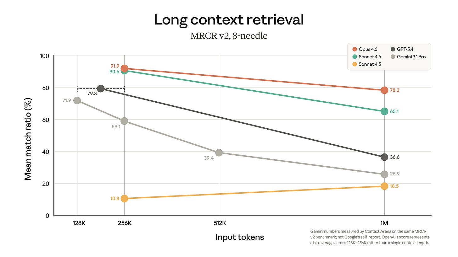 I did not have Anthropic pegged as the lab most likely to seize the long-context narrative in March, but here we are. For a while, long context felt like a Google Gemini story, and then, briefly, like an OpenAI comeback story. Anthropic may now have the strongest claim on the metric that actually matters for professional agentic work: not headline window size, but whether the model can still find the right thing after you bury it under a mountain of tokens.
